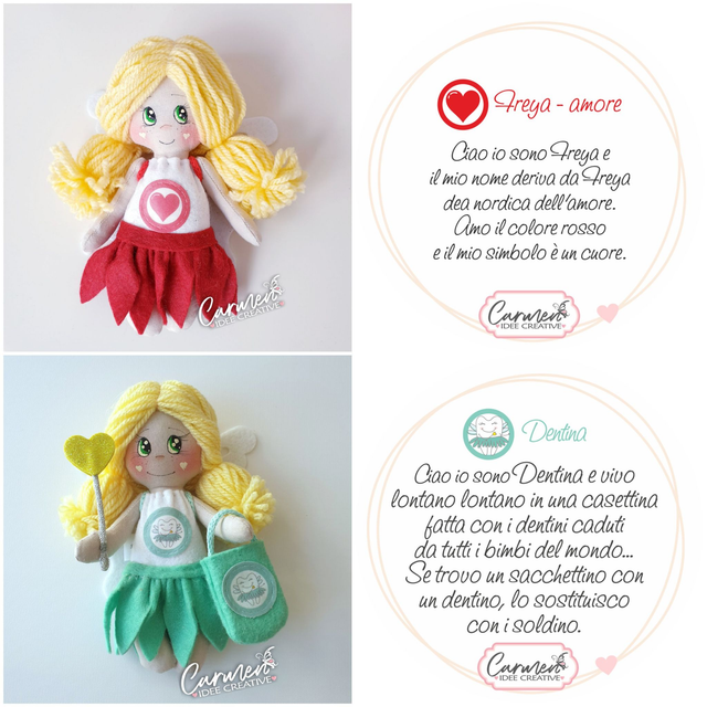 Ogni bambola, creata e dipinta a mano, nasce dall'unione di colori e simboli associati ad emozioni, sentimenti e virtù. La collezione comprende dodici fatine, ognuna con un nome,un simbolo, un significato ed un colore diverso. Scegli la tua o collezionale tutte...