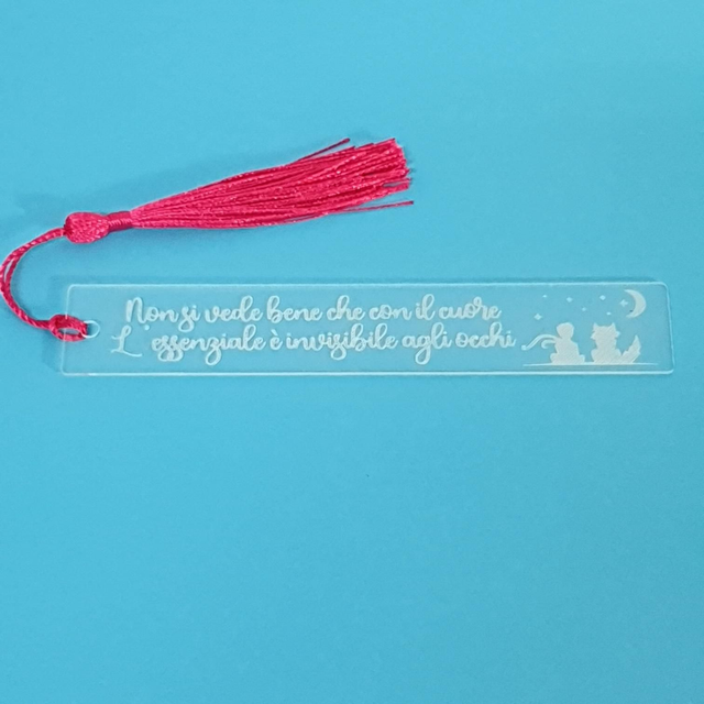 Segnalibro in acrilico trasparente, inciso con personalizzazione inclusa. Dimensioni 14 x 2,5 cm. Inclusa nappina colori in base a disponibilitÃ