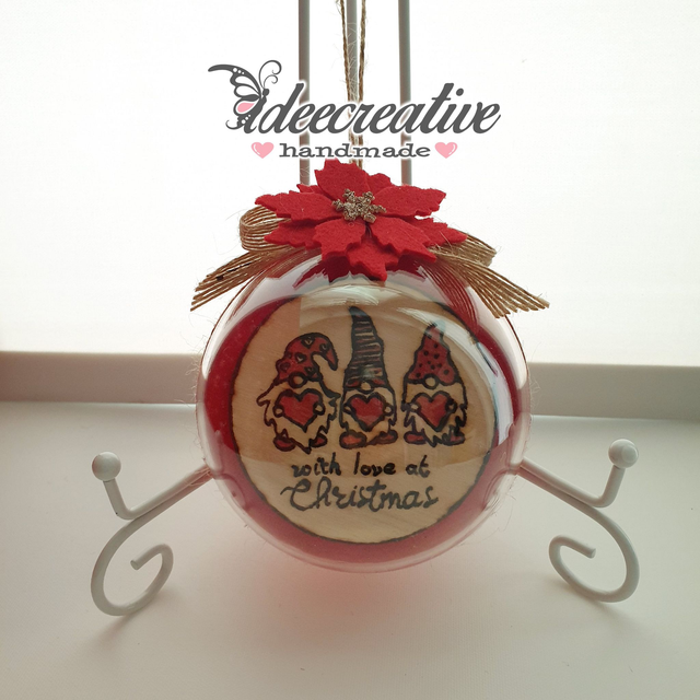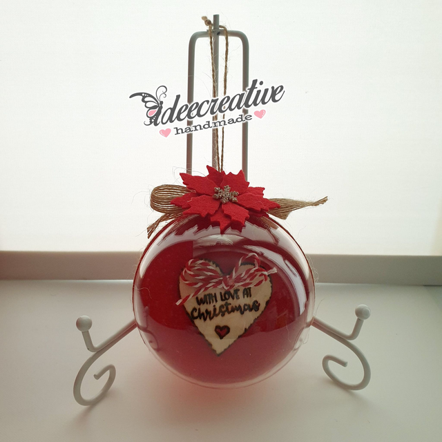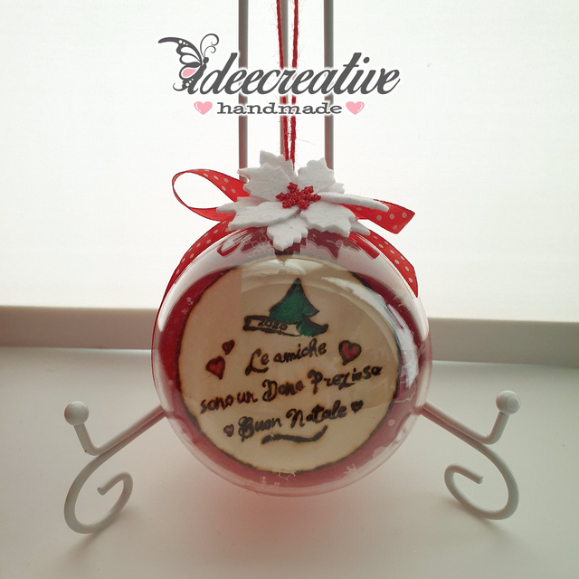 Sfera di Natale in plexiglass personalizzata. All'interno è presente una tag in legno pirografata.